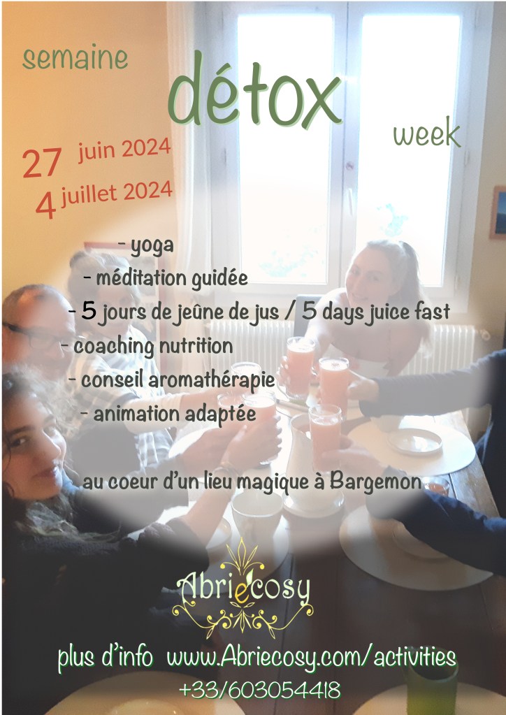 - 13h : animations volontaires (méditation guidée, compresse au gingembre, promenade, massage, détox foie, détox pieds, exercice de respiration, consultations aromathérapie ou bien-être…)