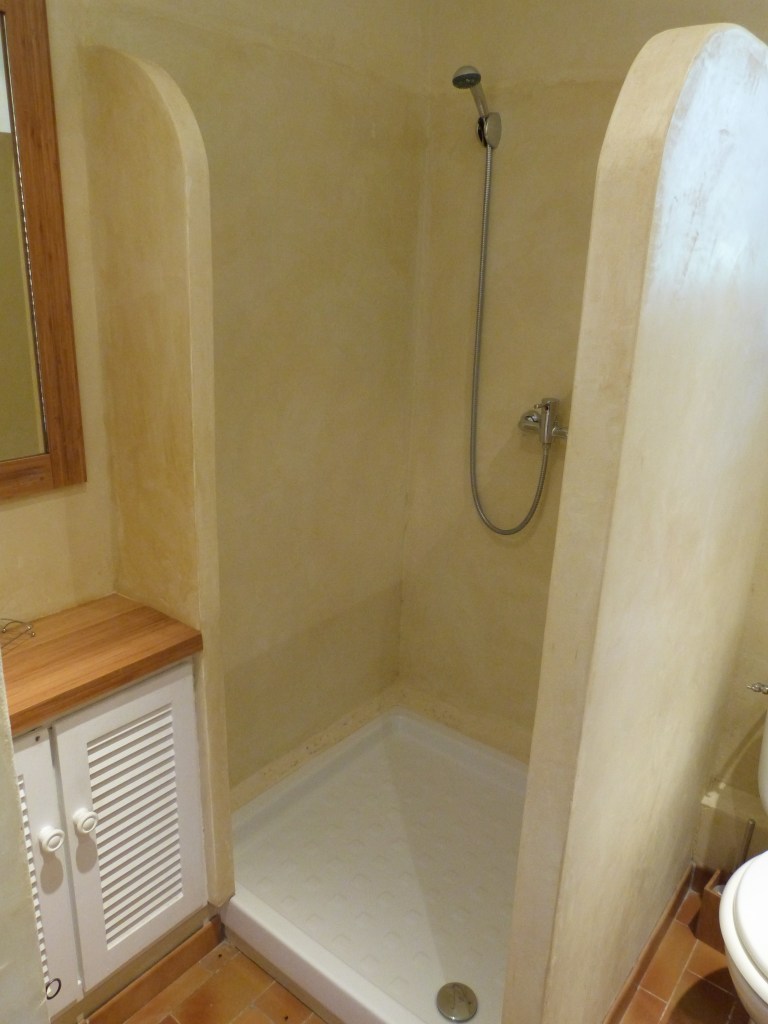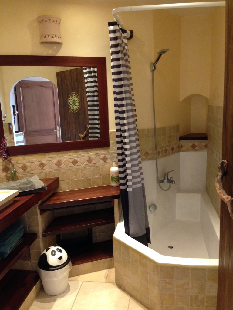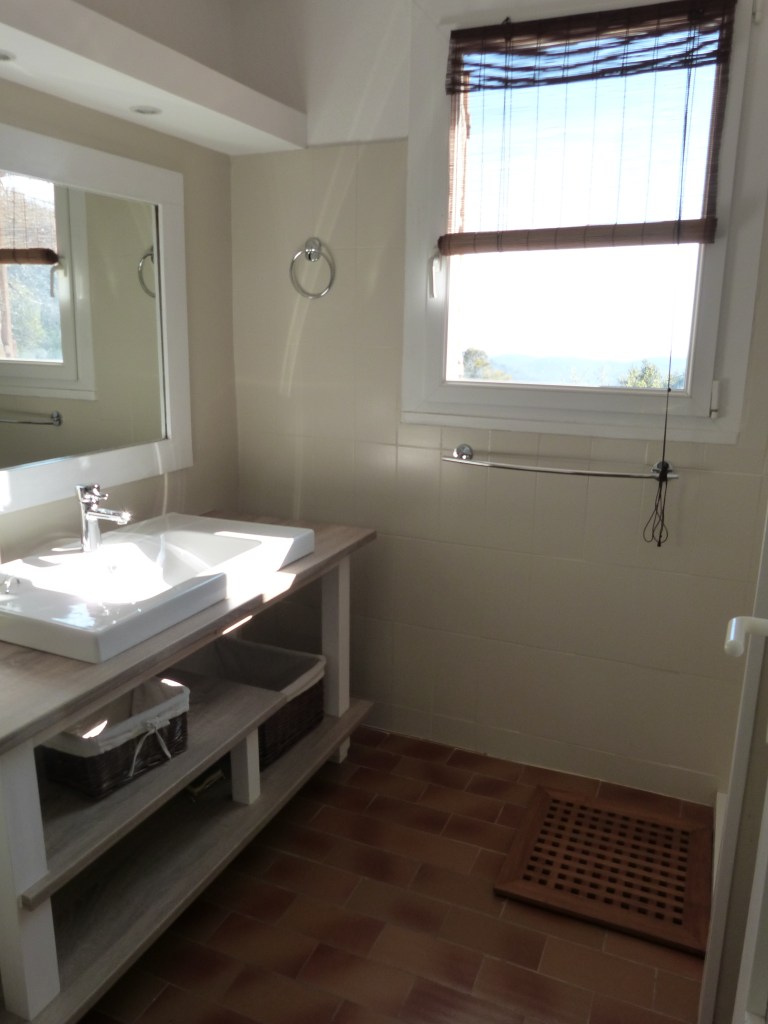 Room Soleil is situated in the old bastide (main house) and is a large room for 3 with a large double bed (180×200) and a single bed (90×200). It has a large window that gives out on the terrace with stunning view over the valley. Room Soleil has its bathroom next door.